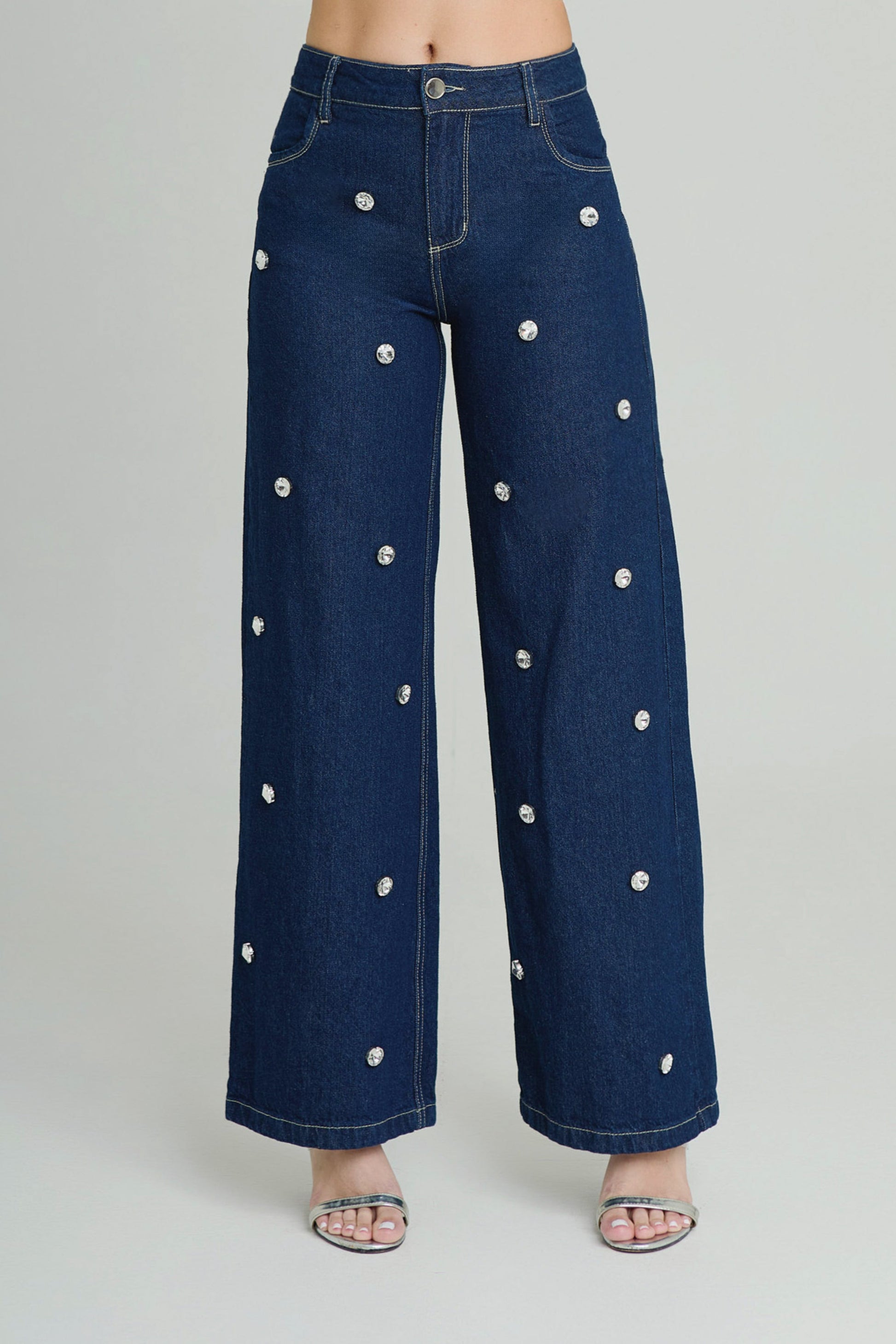 Wide-leg denim pants featuring crystal embellishments for a glamorous touch. The medium high waisted fit and classic design make these pants a versatile statement piece that pairs well with casual or dressy looks.