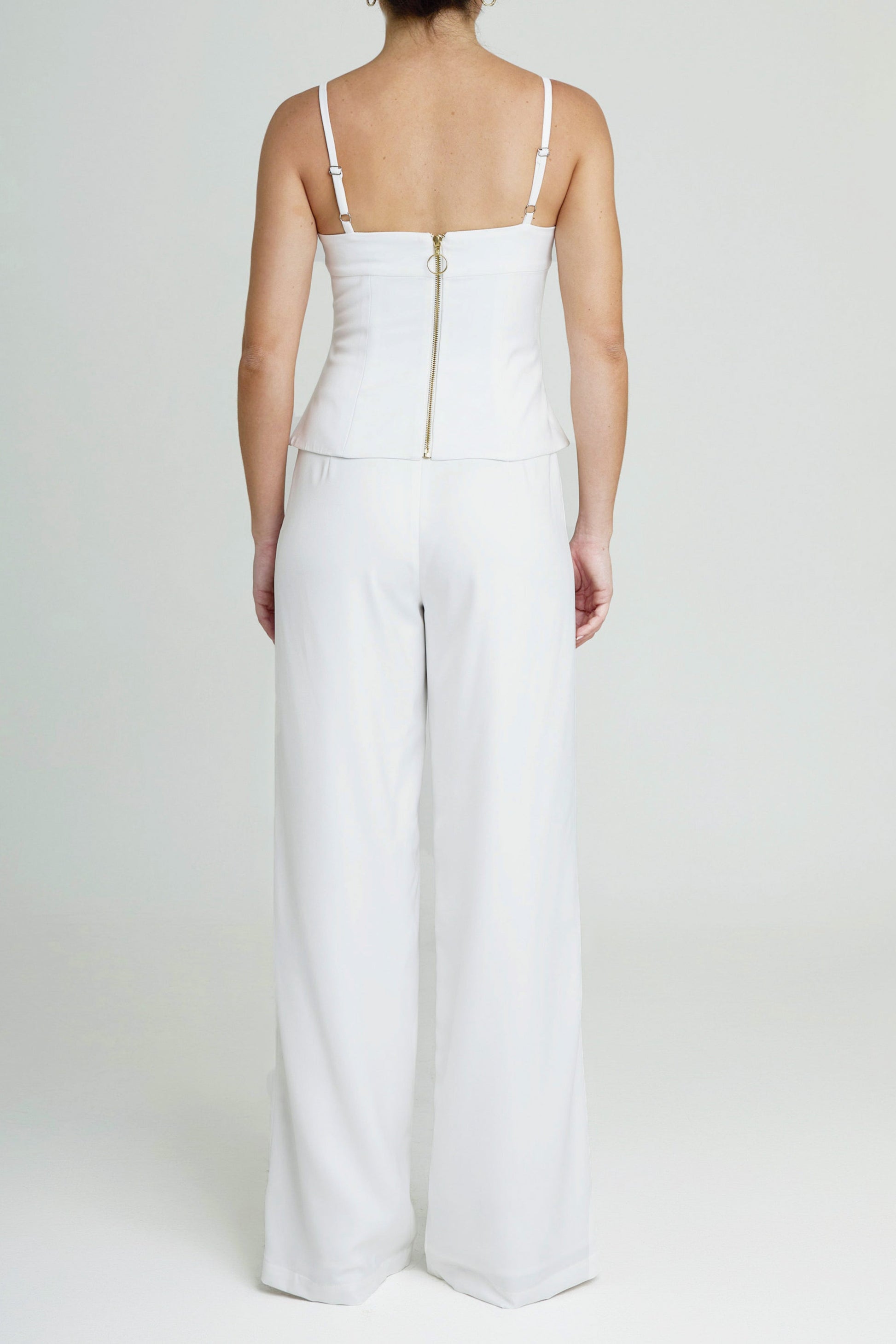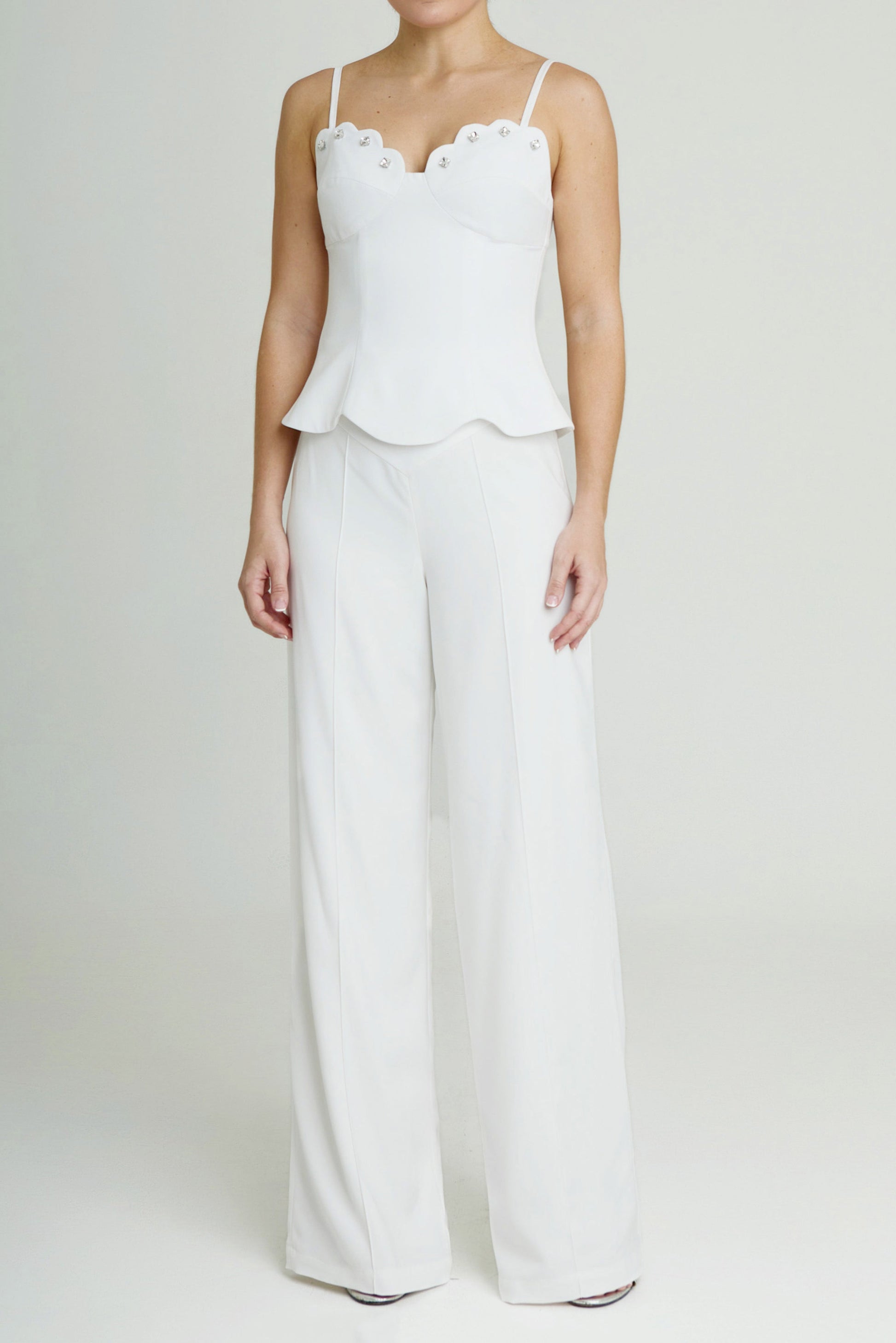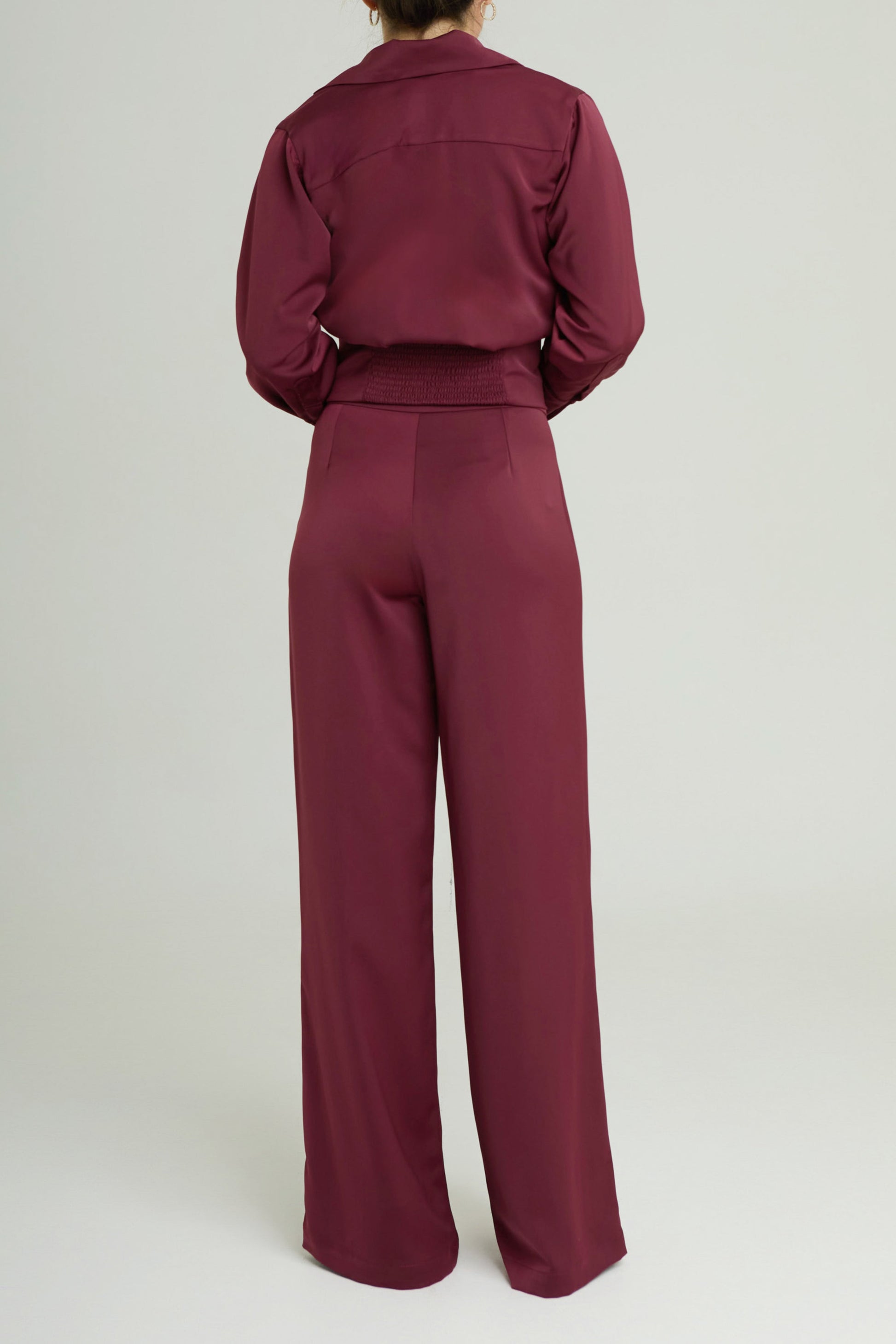 High-waisted trousers featuring a structured V-shaped waistband and wide legs, crafted from a fluid fabric that drapes elegantly. They include subtle front pleats that elongate the silhouette and deliver a refined, tailored finish.