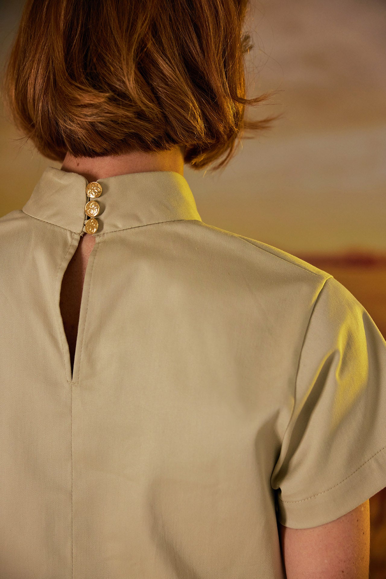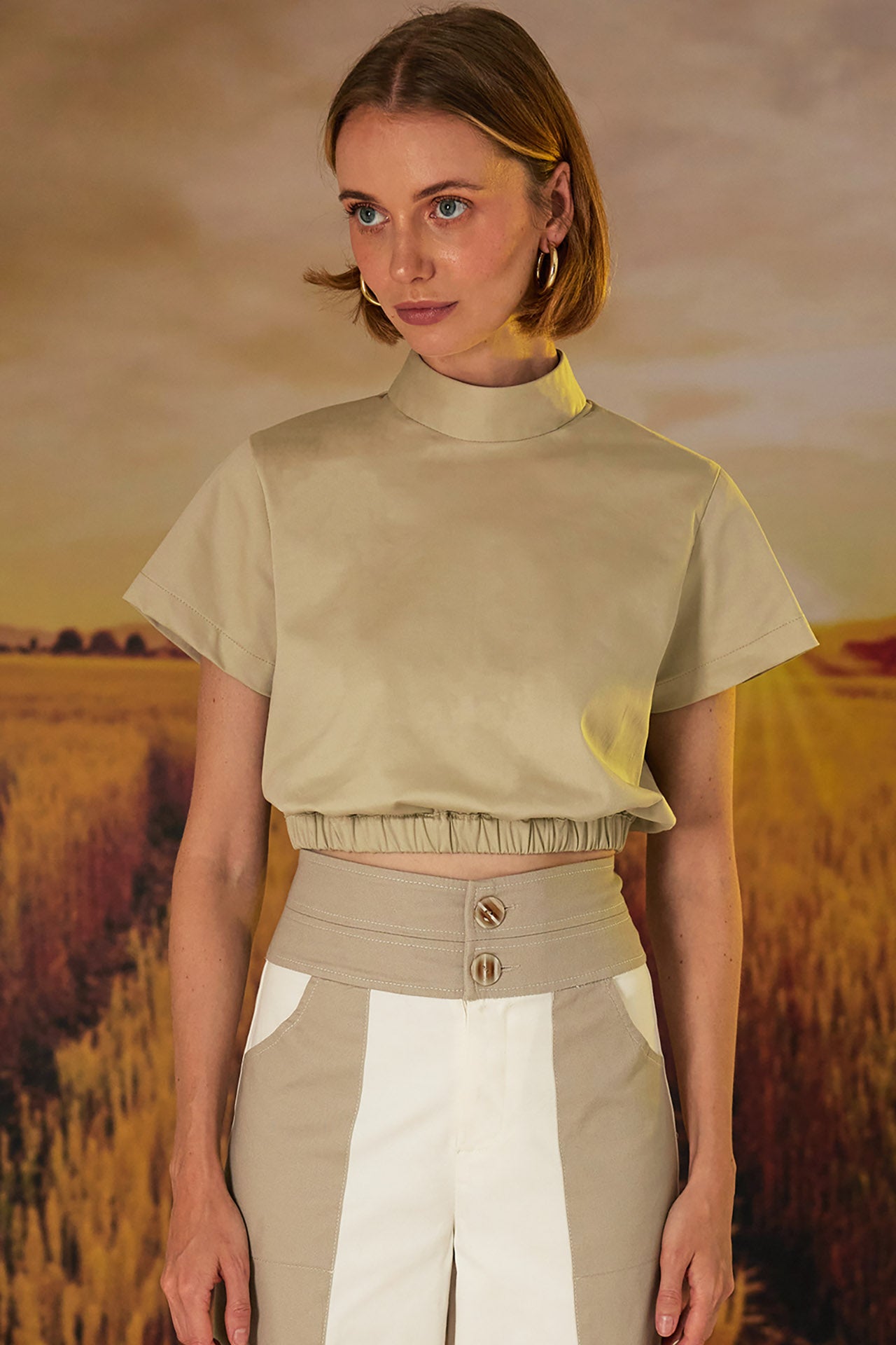 A basic but elevated top. Made of soft cotton, it has a high neck, short sleeves and elastic at the waist for a better fit. Combine it with our Donna Pants for a casual yet chic look!