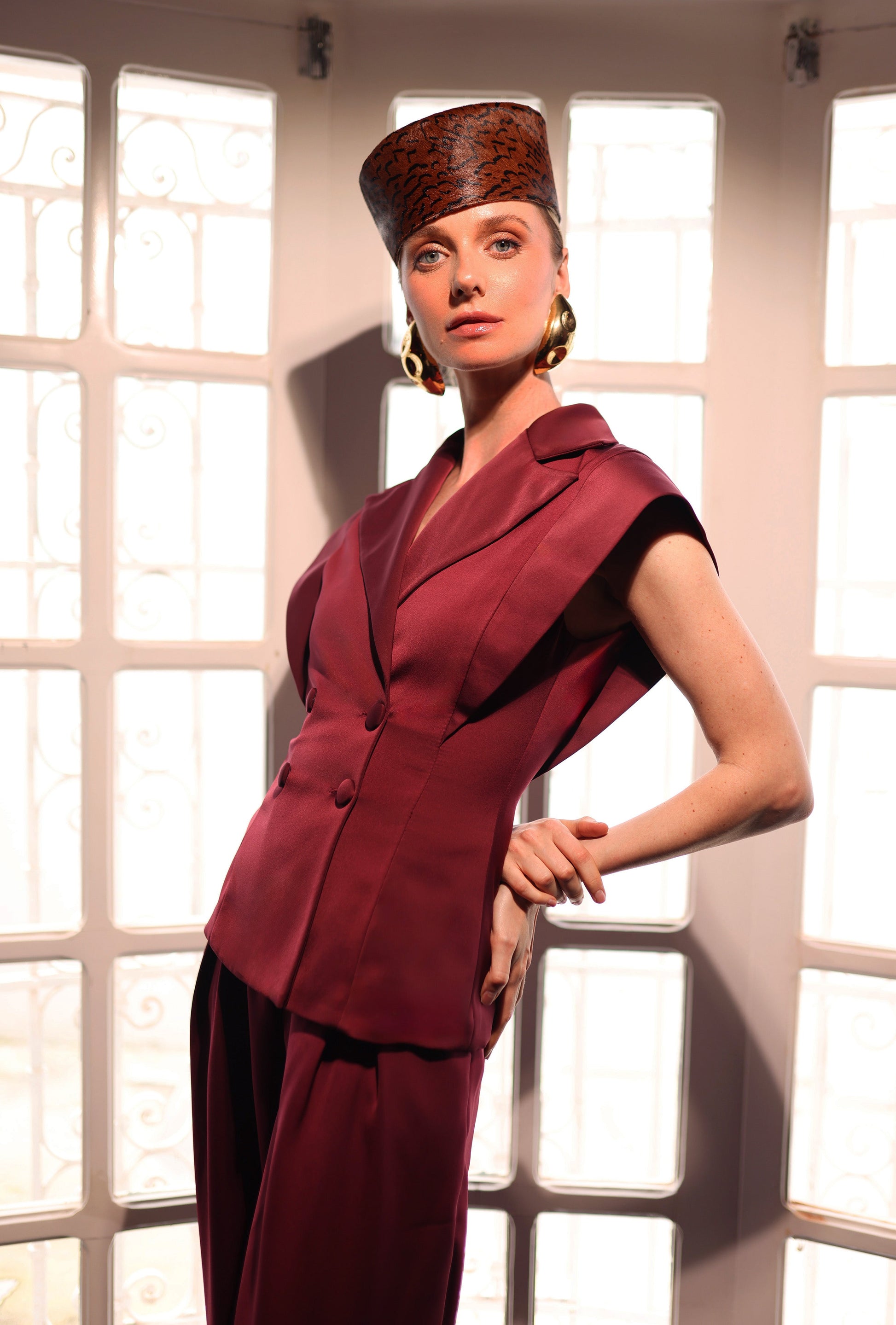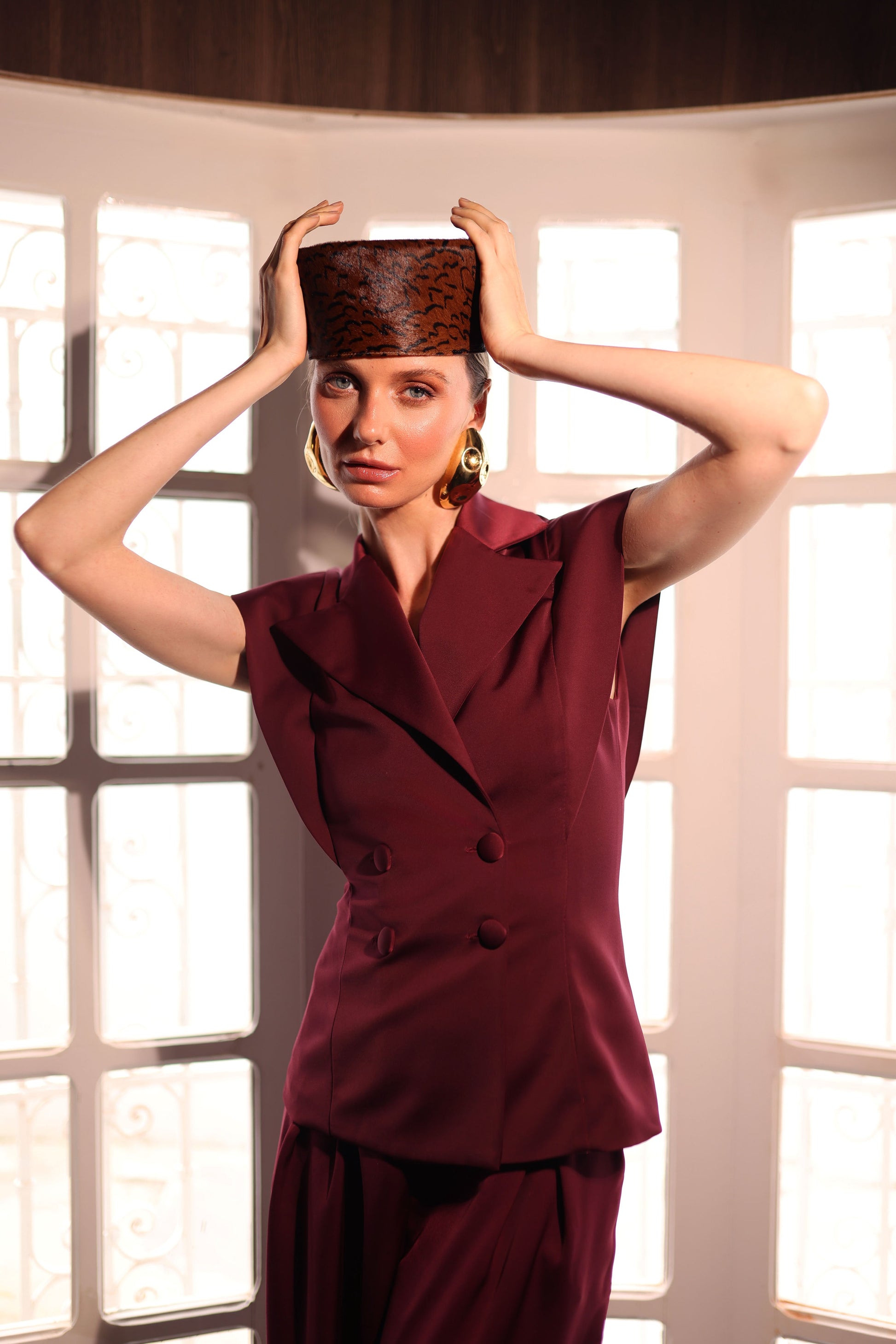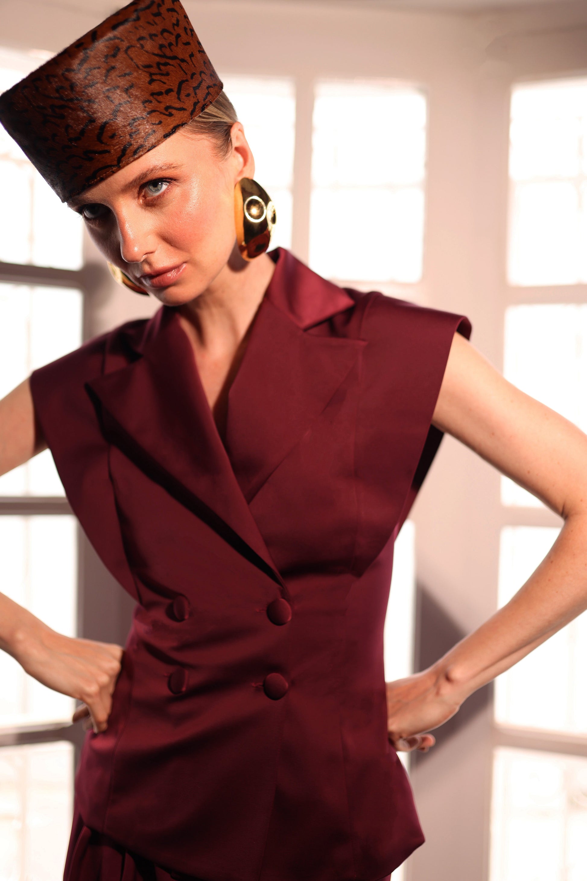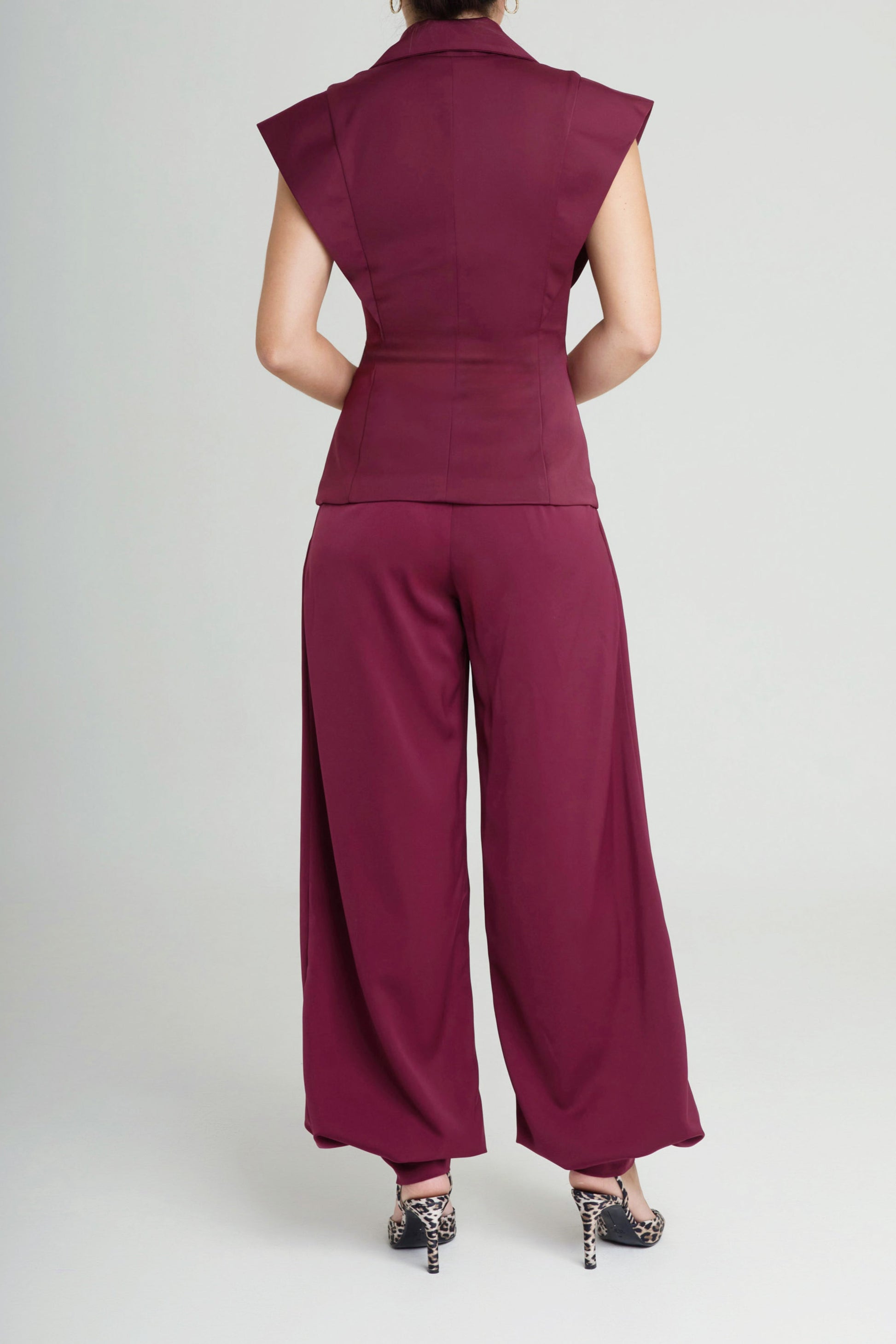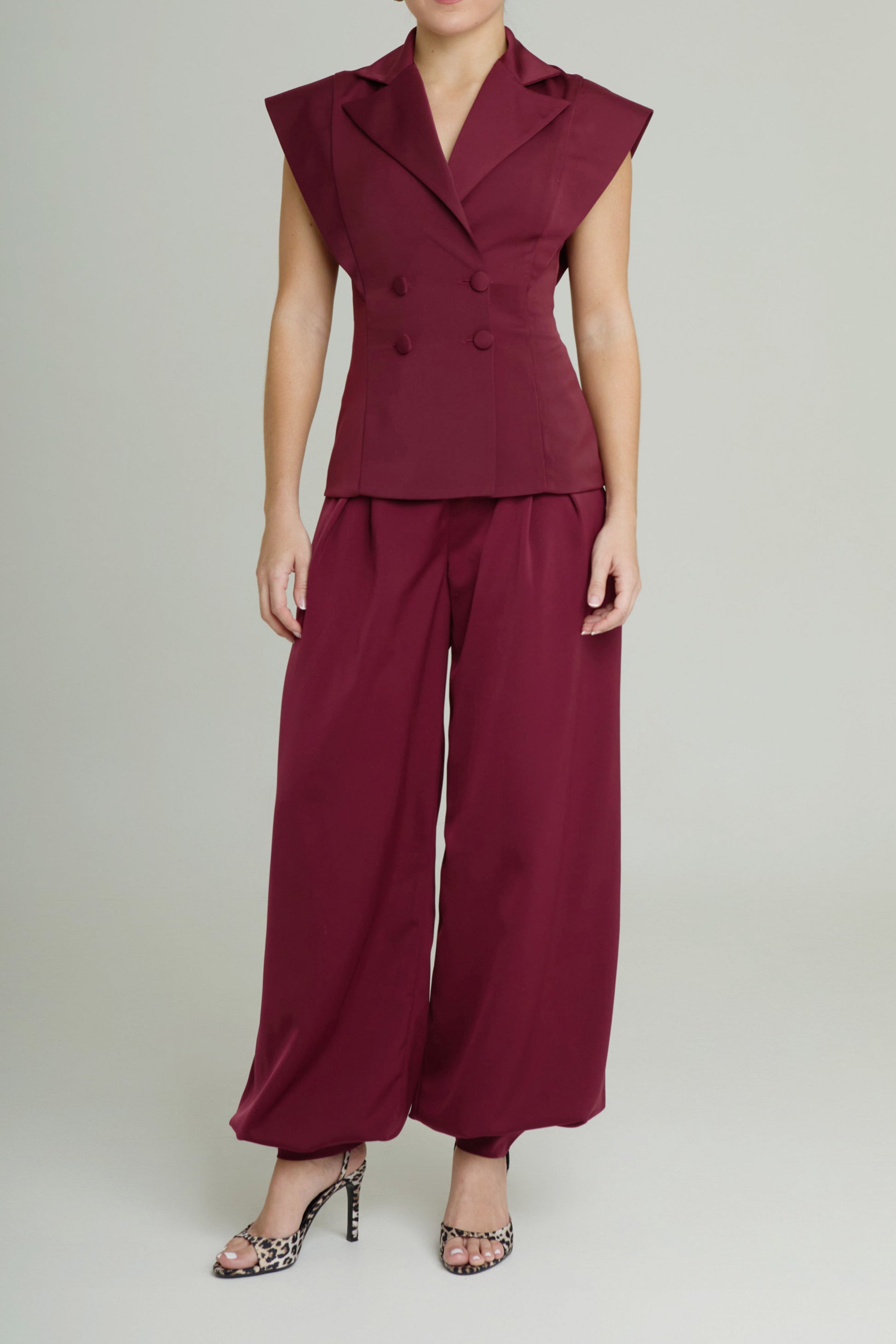 Drop shoulder tailored vest in a deep wine tone, featuring a wide notch lapel, structured shoulders, and a covered double-breasted closure that shapes a defined waist.